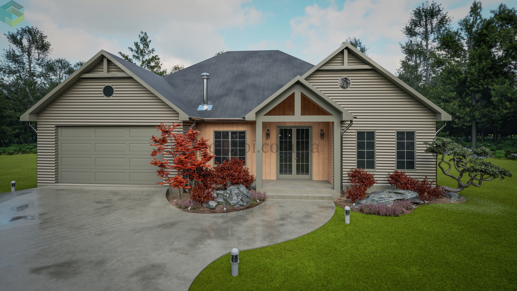 В этом проекте одноэтажного дома предусмотрен просторный гараж на два автомобиля — это крайне актуально в наши дни. Из гаража есть два удобных входа в дом: основной ведет через холл, где можно разместить шкаф для верхней одежды, а второй — через кладовую. Последний вариант особенно удобен для разгрузки покупок из машины и быстрого доступа к продуктам во время приготовления пищи.