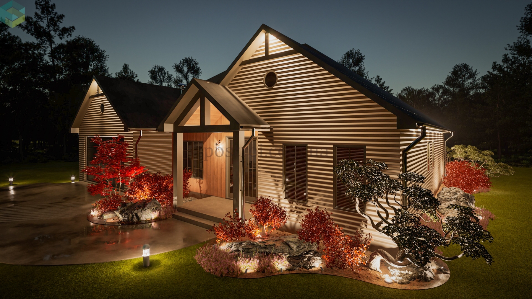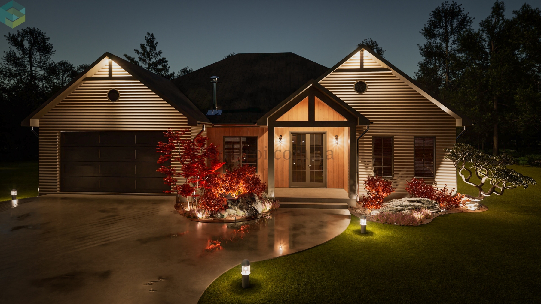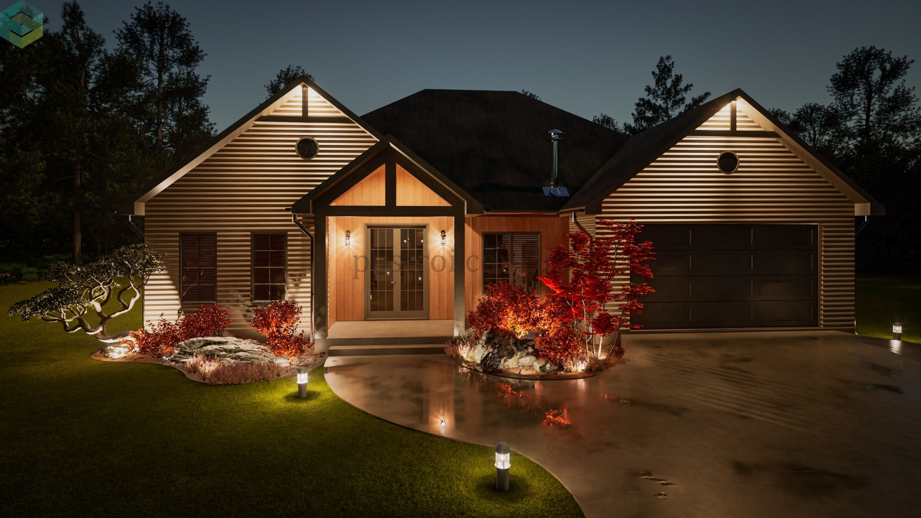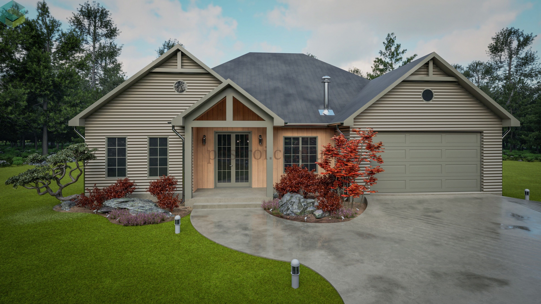 Основной акцент при создании этого плана сделан на обеспечении комфорта и приватности. Детские спальни спроектированы таким образом, что в одной из них может разместиться ребёнок одного пола, а в другой — противоположного. Каждая из этих комнат имеет свою гардеробную и отдельный санузел, хоть и расположенный через холл, что обеспечивает максимальное удобство и независимость. Кроме того, одна из этих спален может легко трансформироваться в гостевую комнату, добавляя гибкости в использовании пространства. Помимо этого, дом прекрасно и компактно спланирован, включая все требуемые помещения как жилого, так и второстепеннгого назначения.