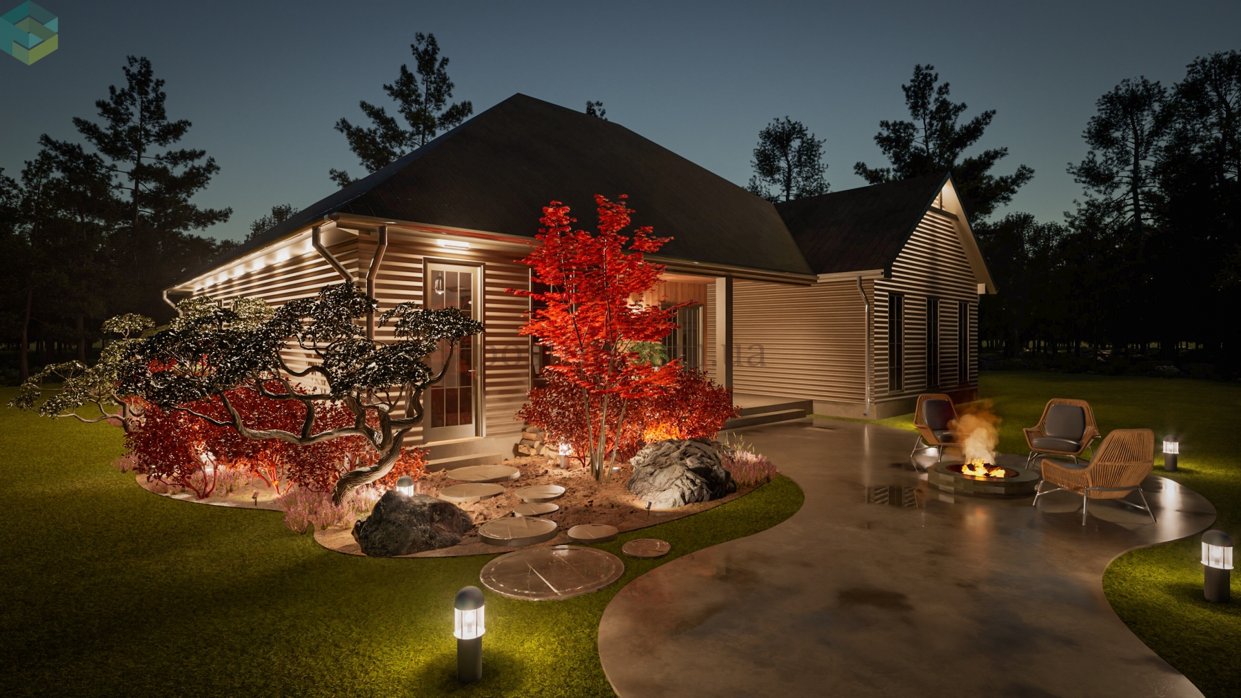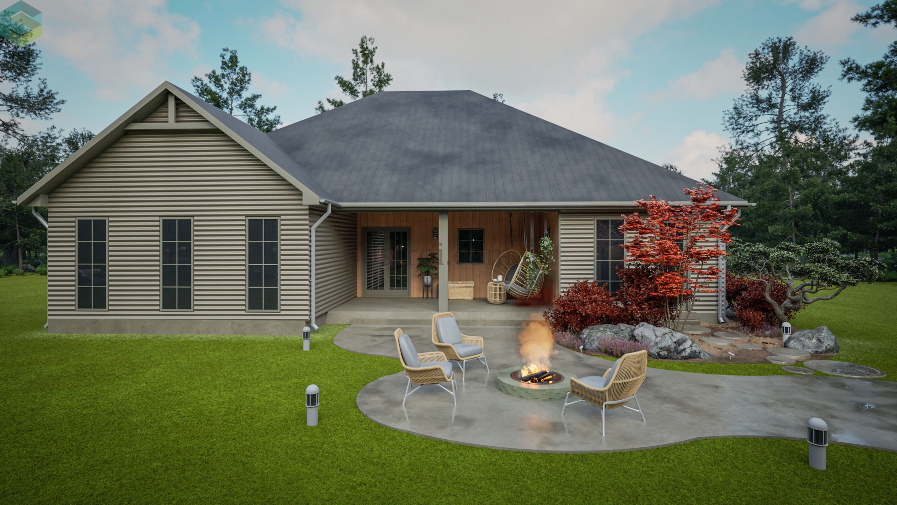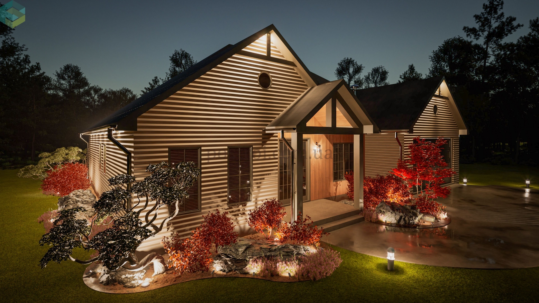 Основной акцент при создании этого плана сделан на обеспечении комфорта и приватности. Детские спальни спроектированы таким образом, что в одной из них может разместиться ребёнок одного пола, а в другой — противоположного. Каждая из этих комнат имеет свою гардеробную и отдельный санузел, хоть и расположенный через холл, что обеспечивает максимальное удобство и независимость. Кроме того, одна из этих спален может легко трансформироваться в гостевую комнату, добавляя гибкости в использовании пространства. Помимо этого, дом прекрасно и компактно спланирован, включая все требуемые помещения как жилого, так и второстепеннгого назначения.