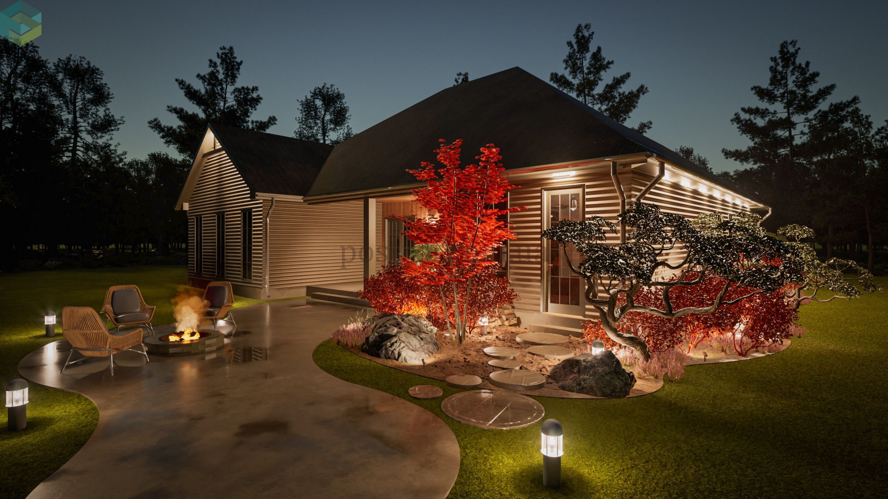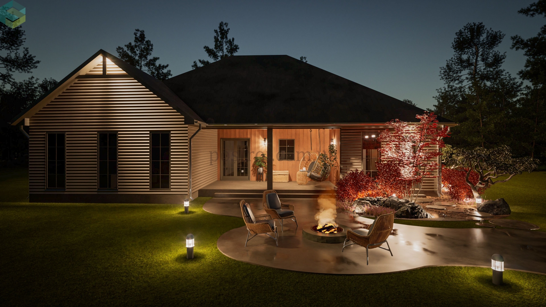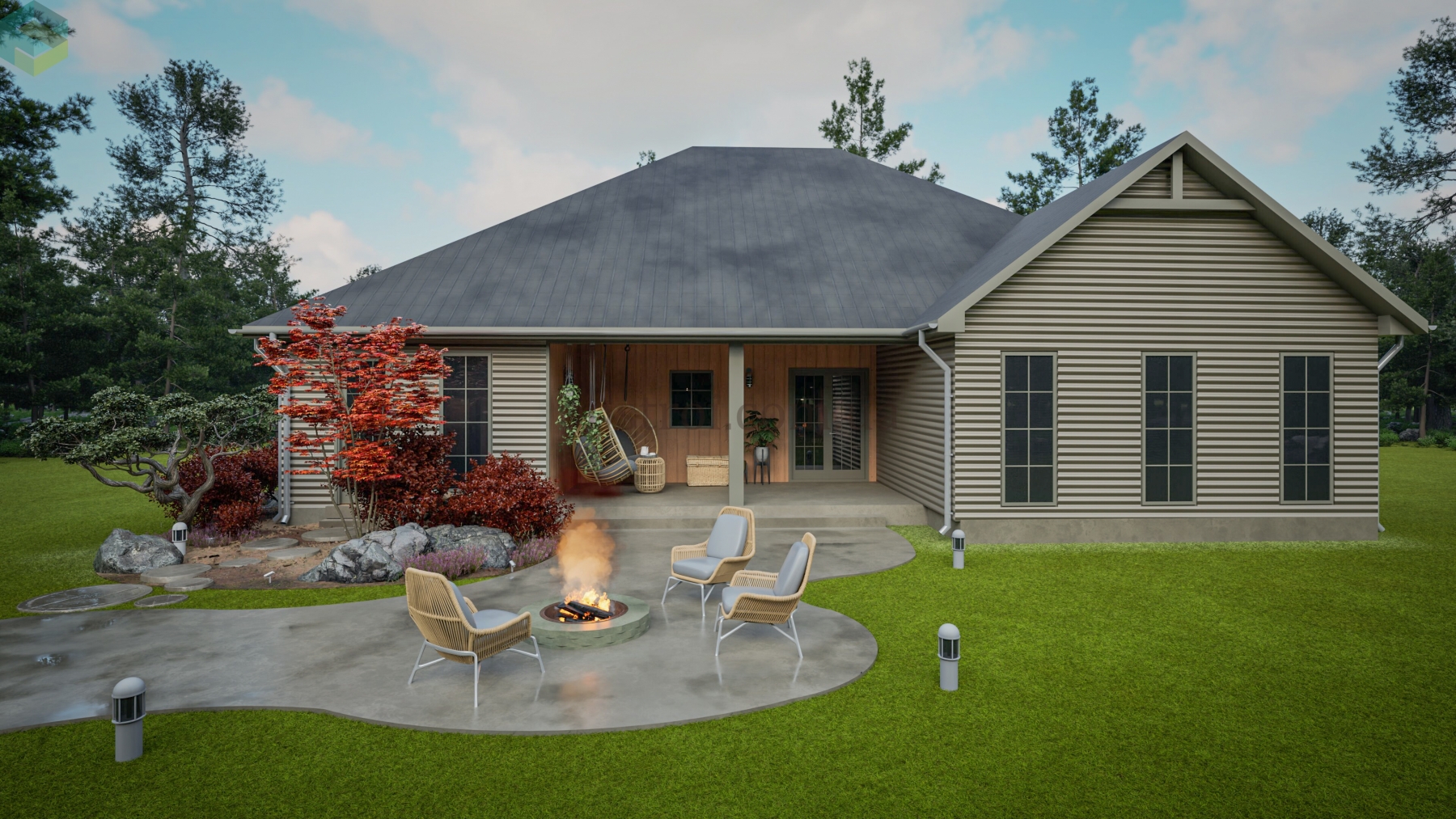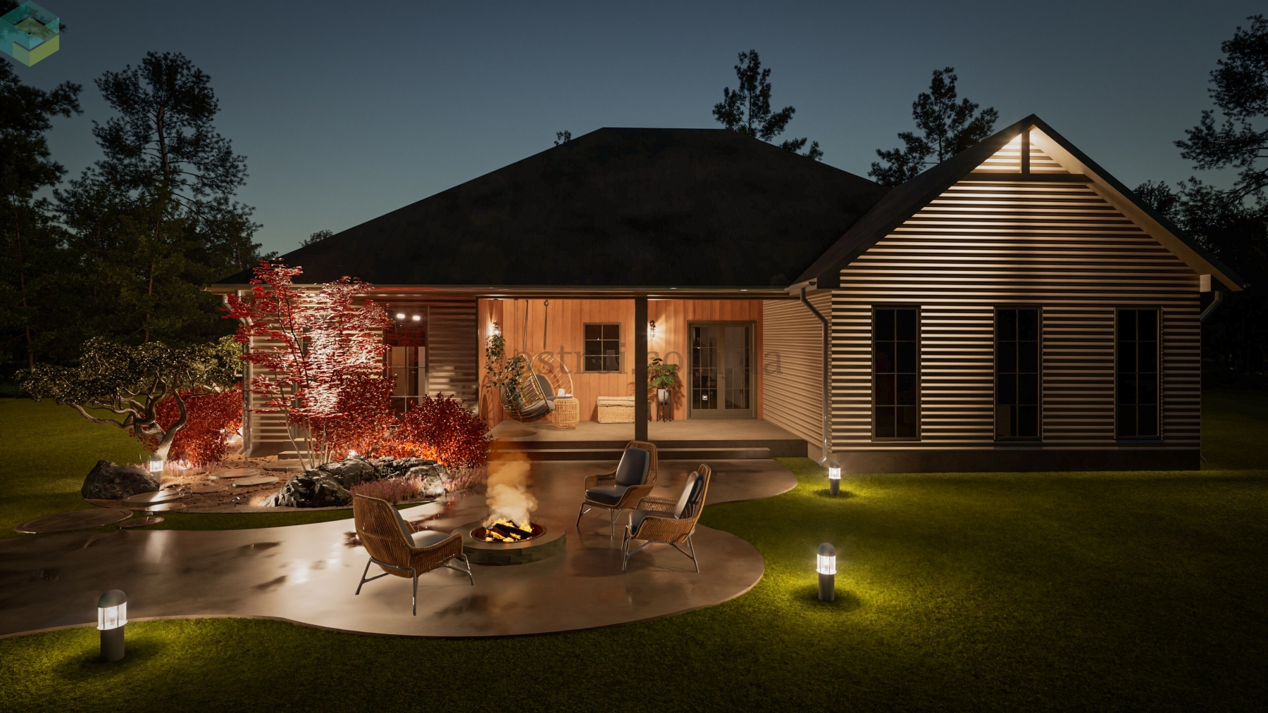 Основной акцент при создании этого плана сделан на обеспечении комфорта и приватности. Детские спальни спроектированы таким образом, что в одной из них может разместиться ребёнок одного пола, а в другой — противоположного. Каждая из этих комнат имеет свою гардеробную и отдельный санузел, хоть и расположенный через холл, что обеспечивает максимальное удобство и независимость. Кроме того, одна из этих спален может легко трансформироваться в гостевую комнату, добавляя гибкости в использовании пространства. Помимо этого, дом прекрасно и компактно спланирован, включая все требуемые помещения как жилого, так и второстепеннгого назначения.