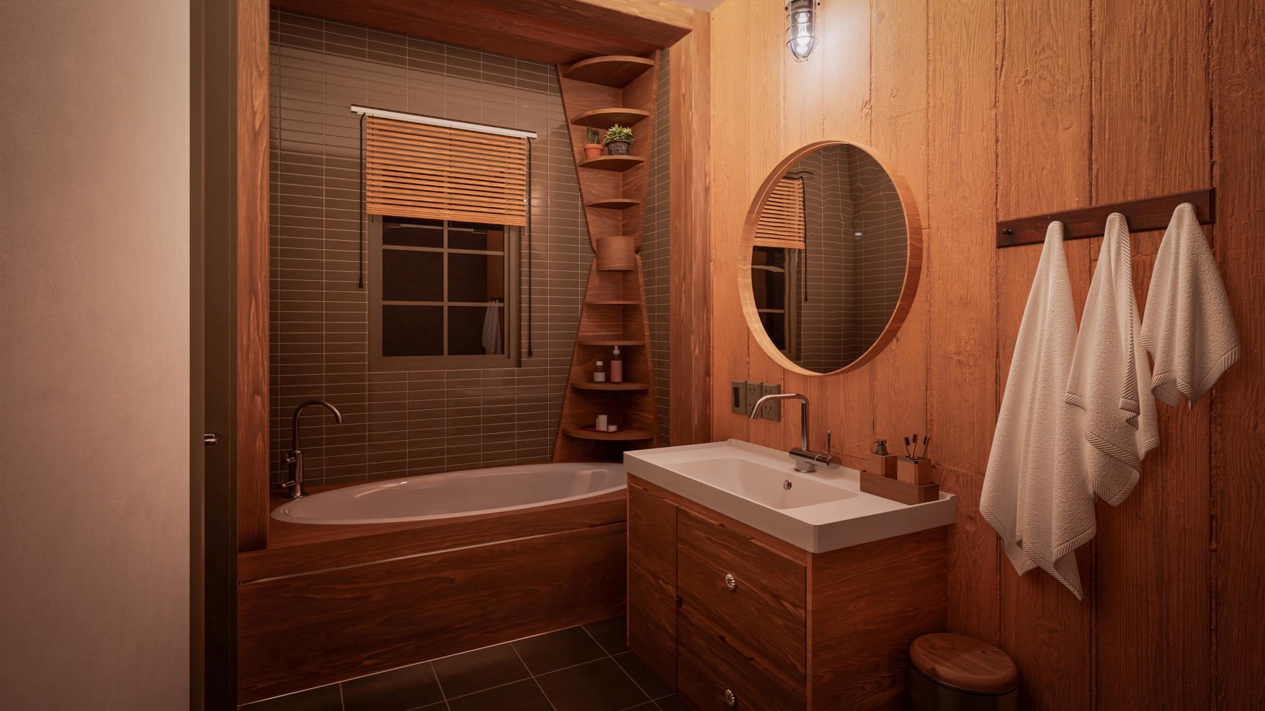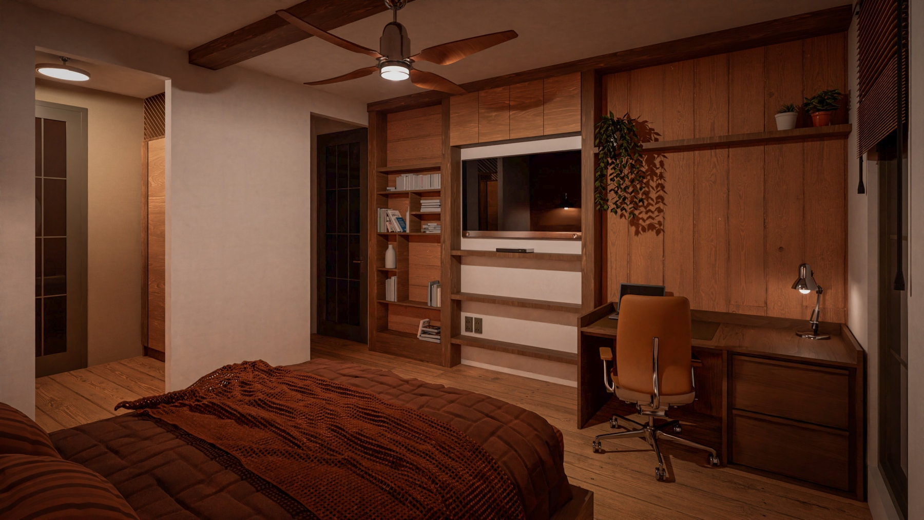 Далее по пути расположен санузел, который может служить как гостевым, так и принадлежать к одной из спален. В проекте предусмотрены две гостевые/детские спальни поменьше и одна мастер-спальня. Мастер-спальня оснащена своим просторным санузлом с душевой, а также прямым проходом в гардеробную.
