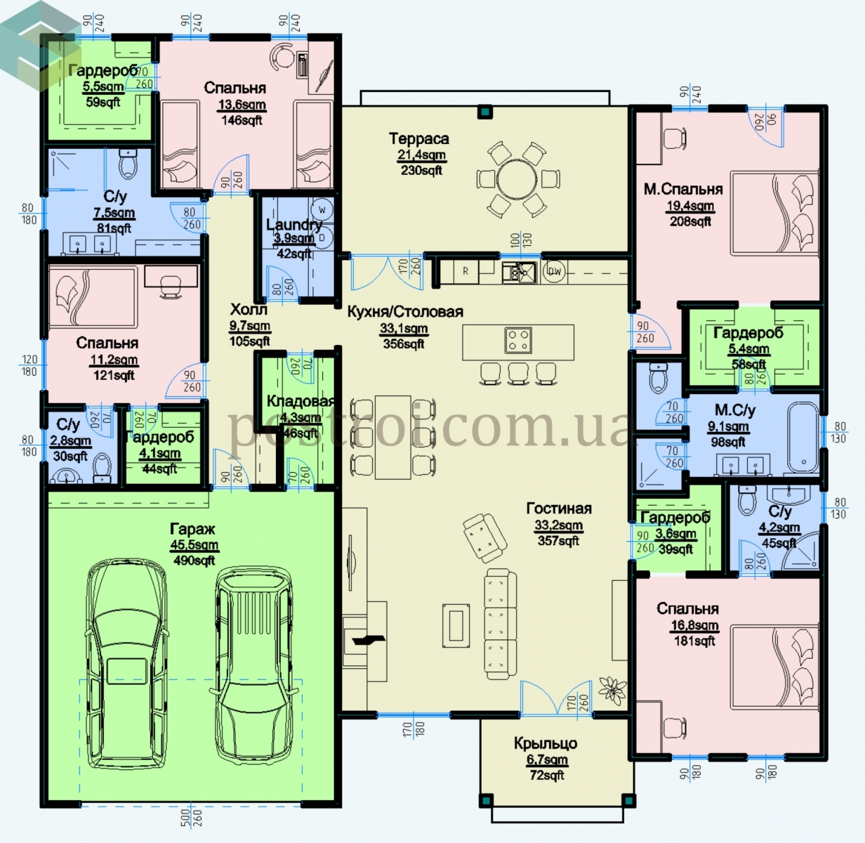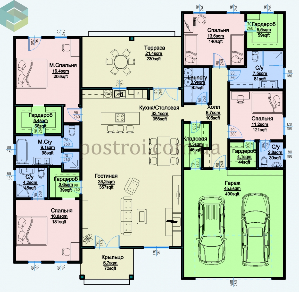 Постирочная расположена в центральной части плана дома, что особенно комфортно для абсолютно всех членов семьи.
